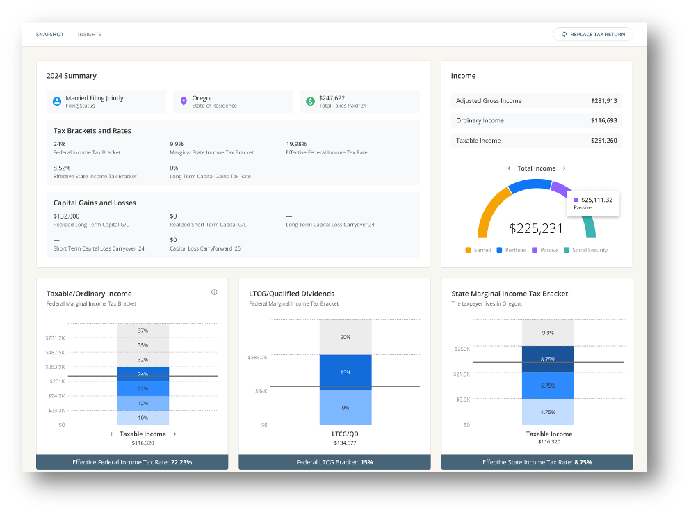 - Clean, visual tax summaries with income, deductions, and effective rates.